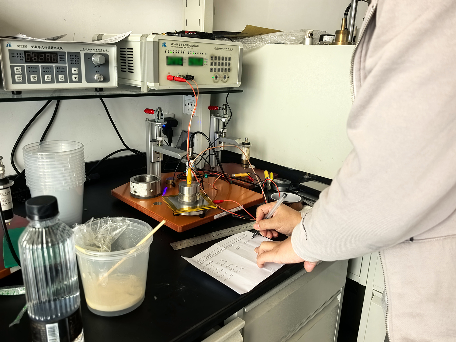 测试环节严格遵循客户制定的阶梯时间方案:分别在样品成型后半小时、1小时、4小时、24小时、48小时进行五次测量。这种间隔测试设计,旨在捕捉材料膨胀倍率变化对电阻值的影响规律。苏州晶格吴工采用国标环形三电极法,使用ST2643超高阻微电流测试仪完成全部检测。该仪器可同时实现体积电阻率与表面电阻率测试,满足高阻绝缘材料检测的严苛要求。