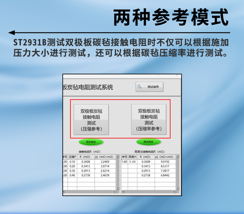 ST2931B型根据行业标准《全钒液流电池 电极测试方法》,在进行双极板碳毡接触电阻测试时,将原来的压强参考改为压缩率参考,这种参考模式更符合碳毡的物理特性。全钒液流燃料电池双极板碳毡接触电阻测试仪(压缩率参考)源厂
