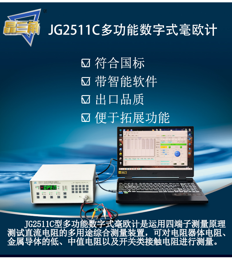 JG2511C多功能数字式毫欧计是直流电阻测试仪,可以测试通讯电路电阻,是0.5%高精度天线系统电阻测试仪,苏州晶格提供顺丰包邮服务,技术终身服务,让您购买无忧!苏州晶格JG2511C通讯电路电阻测试仪天线系统电阻测量仪源头厂家顺丰包邮