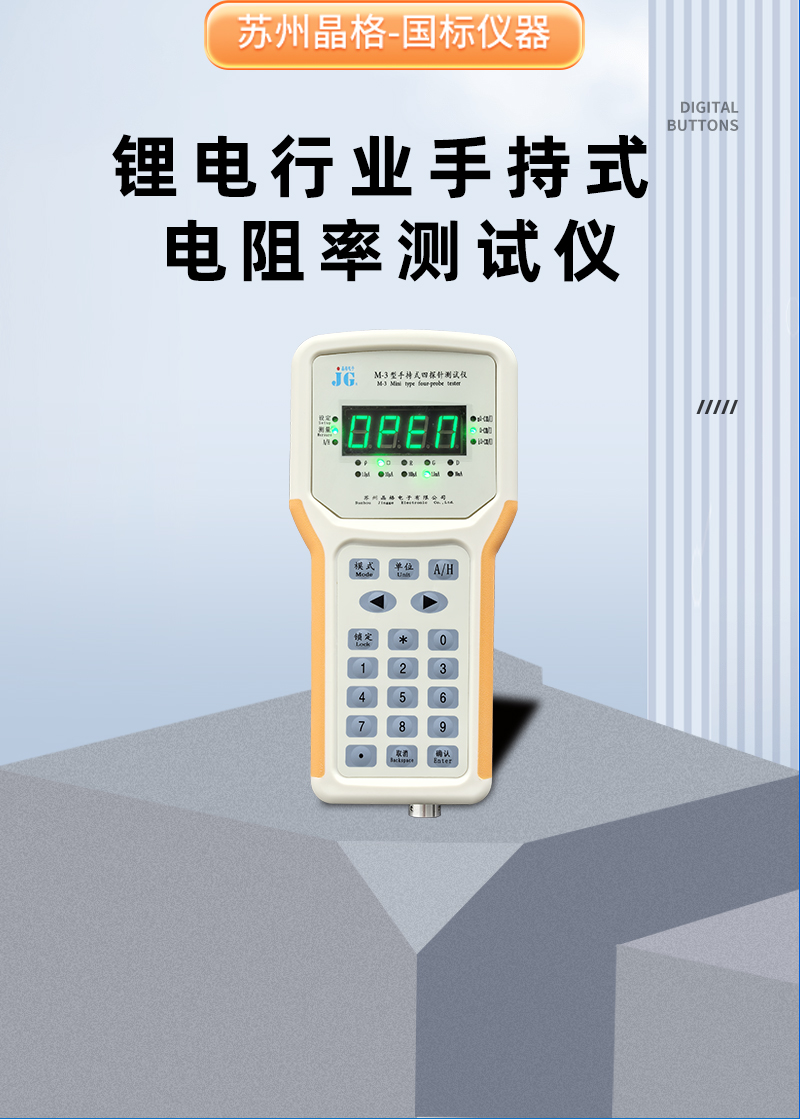 晶格M-3型锂电行业手持式电阻率测试仪,符合国标,精度高达0.5%,具备5档电流量程,满足锂电池材料多场景测试需求。小巧便携,内置锂电池,支持现场快速测量。作为国标制定单位之一,苏州晶格品质可靠,提供免费测样、现货直发及终身售后保障,是锂电研发与生产检测的理想选择。晶格M-3型锂电行业手持式电阻率测试仪 源头厂家