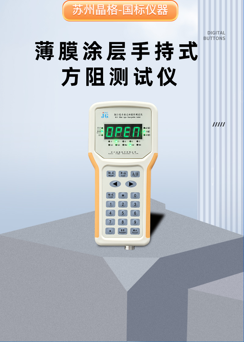 晶格M-3型薄膜涂层手持式电阻率测试仪,适用于ITO膜、导电涂层、光伏镀层等材料导电性能测试,符合国标,精度达0.5%,支持5档电流量程,测量范围广。仪器小巧便携,内置锂电池,适用于现场快速检测。苏州晶格薄膜涂层手持式方阻测试仪 小巧便携 锂电池充电