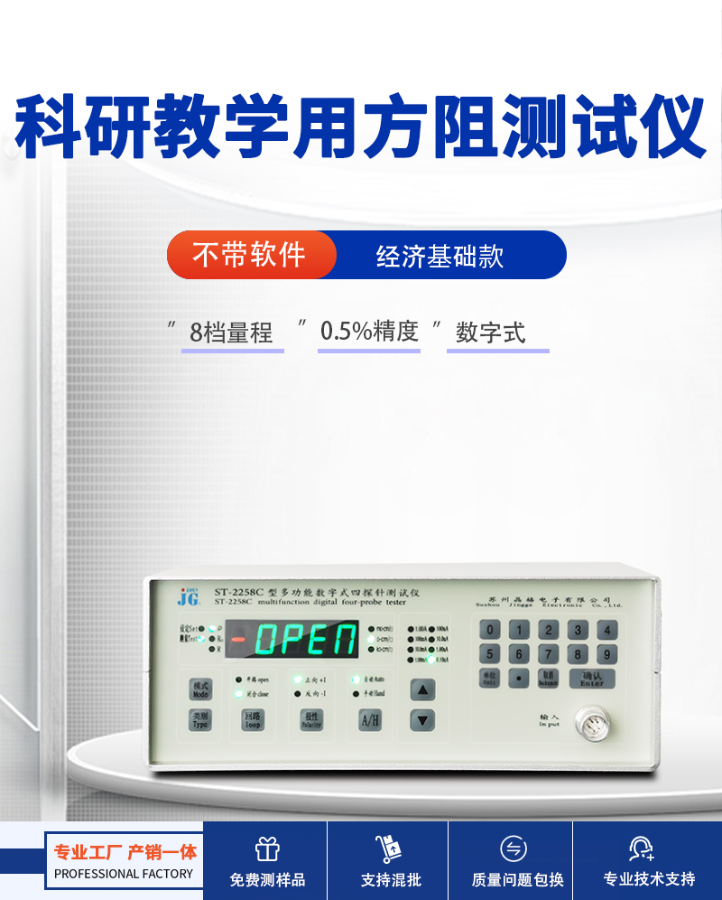 晶格科研教学方阻测试仪(ST-2258C),经济适用型,采用四探针法,专为高校、研究所及教学实验设计,测量准确稳定。设备具备数字显示与多功能按键,操作简单易学,适合材料电学性能基础研究。源头厂家直供,符合国家标准,支持免费测样,现货直发,终身售后保障,是国标制定单位之一,性价比高,实用可靠。苏州晶格经济适用型四探针方阻测试仪科研教学用源头厂家顺丰包邮