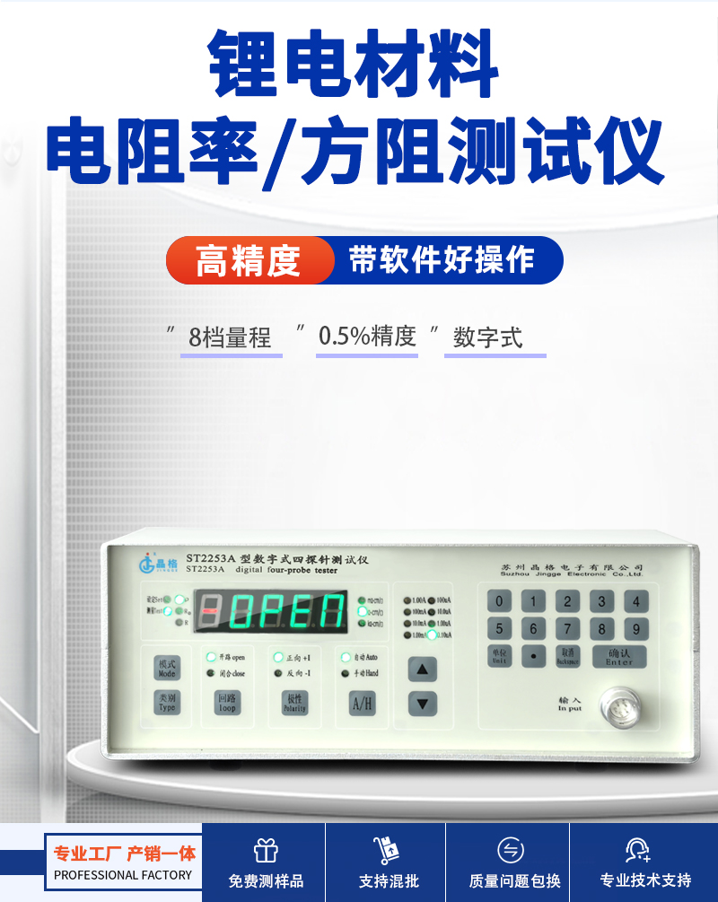 晶格ST2253A锂电材料电阻率测试仪,高精度集成专业软件,采用四探针法,适用于锂电池正负极材料、涂布膜等的电阻率与方阻测量,结果精准可靠。配套智能测试软件,支持数据采集与分析,助力研发及质检高效开展。设备操作便捷,广泛用于材料企业与科研院所。源头厂家直供,符合国标,提供免费测样、现货直发及终身技术支持。苏州晶格四探针电阻率方阻测试仪高精度带软件适合锂电行业源头厂家