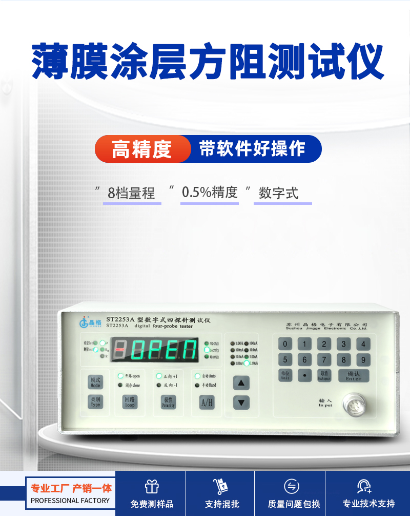 晶格ST2253A薄膜涂层方阻测试仪,高精度带软件,采用四探针法,可测各类薄膜涂层的方阻,测试稳定可靠。仪器含有配套软件,支持数据采集、保存、打印、分析等功能,操作简单,适用于材料研发公司和科研院所。源头厂家直供,符合国家标准,支持免费测样,现货直发,终身售后保障,品质值得信赖。苏州晶格四探针法薄膜涂层方阻测试仪高精度带软件源头厂家顺丰包邮