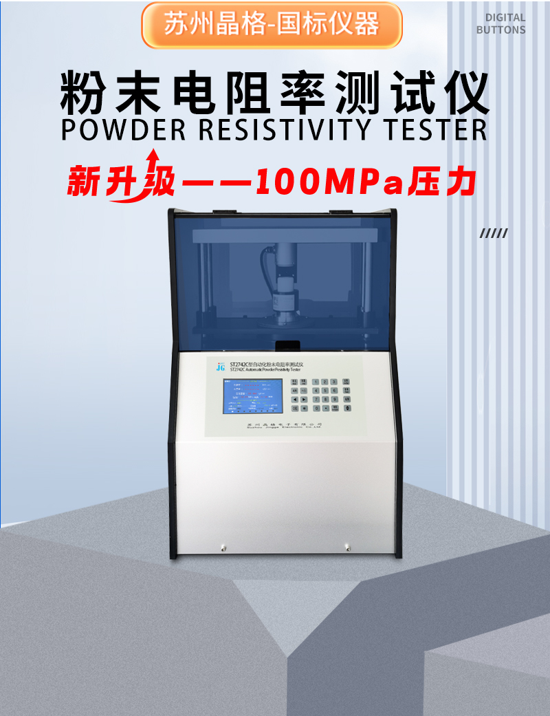 ST2742C 全自动四探针粉末电阻率测试仪,是导体、半导体材料电阻率测试仪,一次装料,电阻率、压强、高度同步式连续多点测试,自动绘制粉末“电阻率-压强”曲线,是国标规定的粉末电阻率标准测试方式,测试精度高、重复性好、源头厂家等。此方式可避免传统异步式的先压片脱模后再四探针测试的缺陷:误差大,重复性差,直至散块,不能成形无法测试的问题。苏州晶格ST2742C型全自动四探针粉末电阻率测试仪 同步式连续多点测试 测试精度高 重复性好 源头厂家