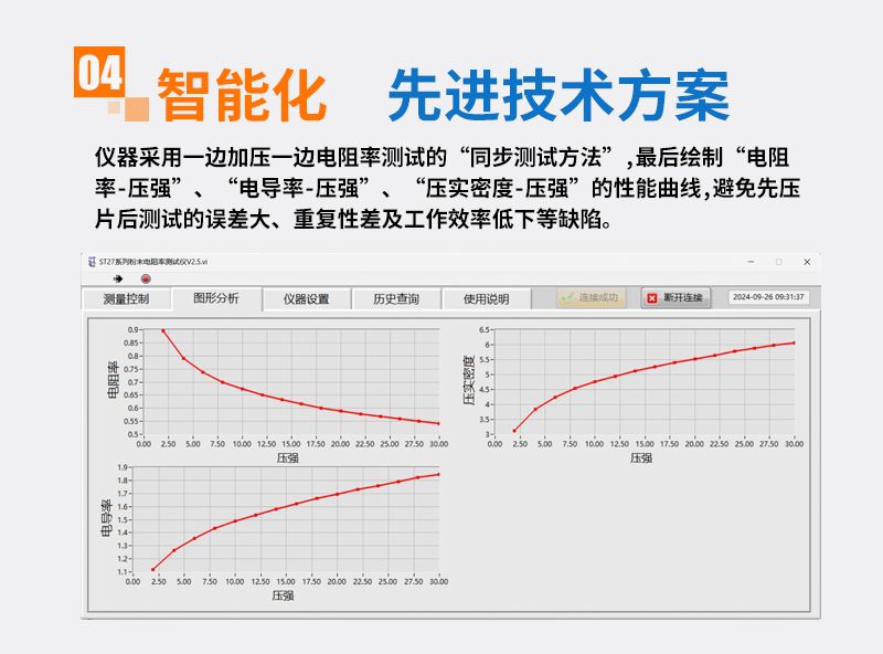 一次装料,电阻率、压强、高度同步式连续多点测试,自动绘制粉末“电阻率-压强”曲线,