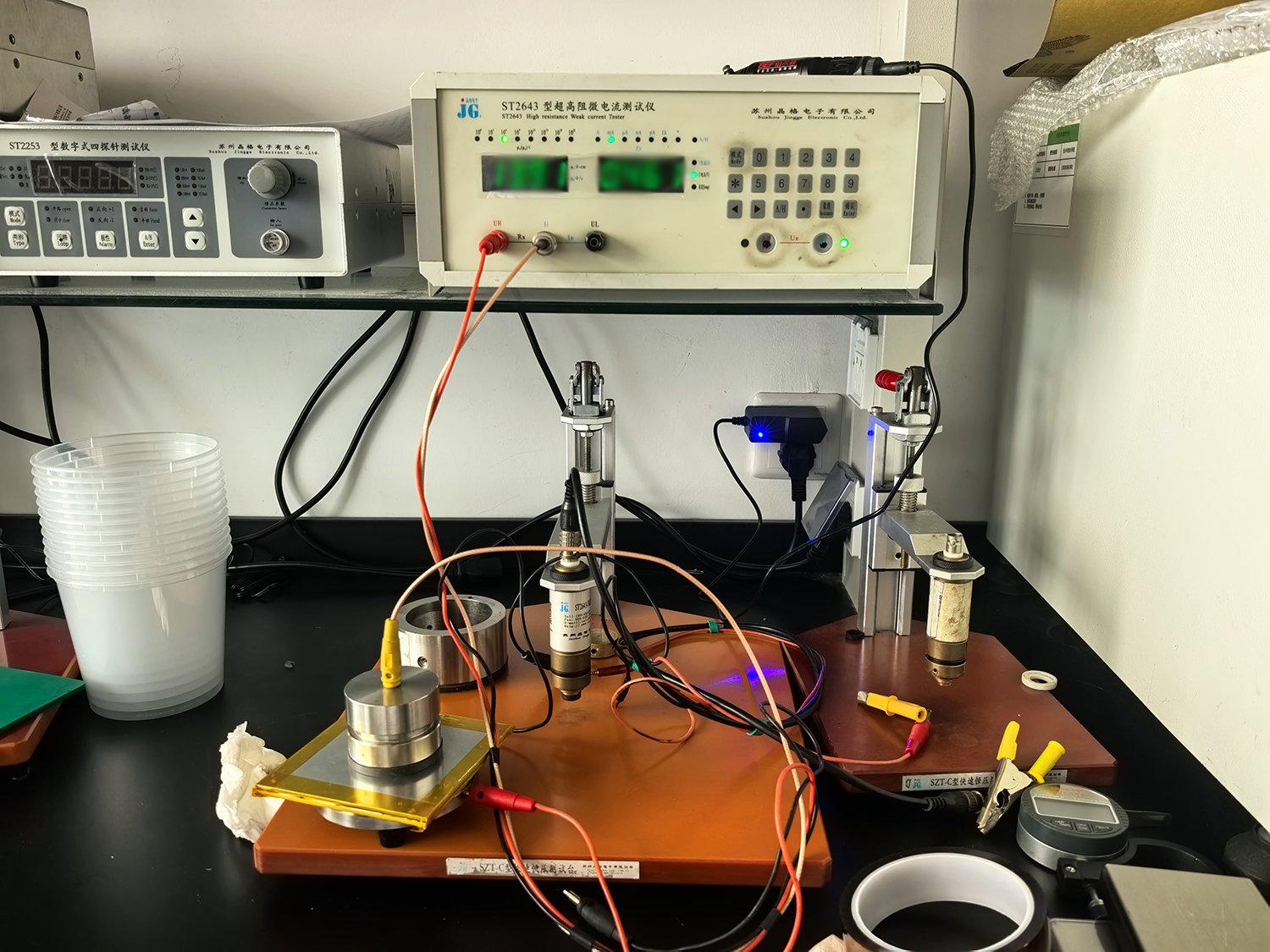 测试环节严格遵循客户制定的阶梯时间方案:分别在样品成型后半小时、1小时、4小时、24小时、48小时进行五次测量。这种间隔测试设计,旨在捕捉材料膨胀倍率变化对电阻值的影响规律。苏州晶格吴工采用国标环形三电极法,使用ST2643超高阻微电流测试仪完成全部检测。该仪器可同时实现体积电阻率与表面电阻率测试,满足高阻绝缘材料检测的严苛要求。