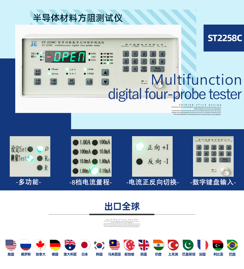 晶格半导体方阻测试仪,采用四探针法,专为硅片、ITO膜、半导体材料等设计,测量精准高效。设备支持多功能数字显示,操作简便,适用于科研、生产全场景。源头厂家直供,符合国家标准,支持免费测样,现货直发,终身售后保障,品质可靠。苏州晶格ST2258C四探针方阻测试仪半导体材料方阻测试仪源头厂家