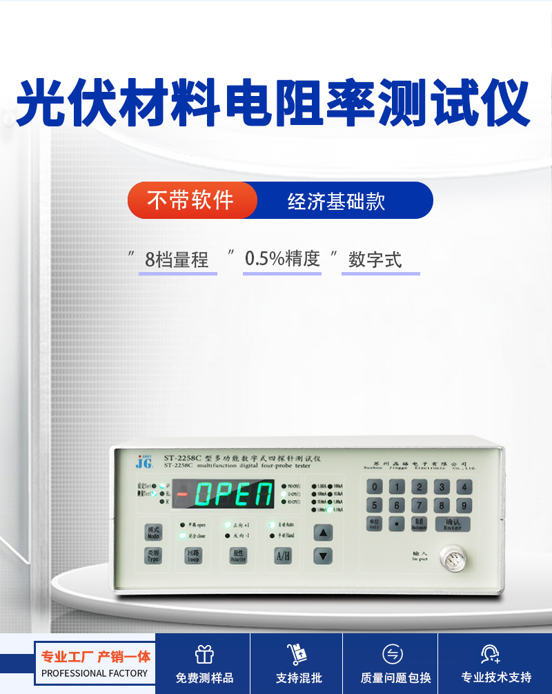 晶格光伏材料电阻率测试仪(ST2258C),基础入门款,采用四探针法,可测光伏材料电阻率,稳定可靠。设备具备多功能数字显示,操作简便,适用于实验室及产线检测。源头厂家直供,符合国家标准,支持免费测样,现货直发,终身售后保障,是您的性价比之选。苏州晶格光伏材料电阻率测试仪四探针法经济入门款源头厂家性价比高