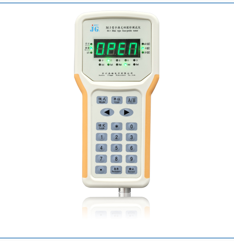 苏州晶格M-3手持式四探针测试仪,采用四探针法,0.5%精度,5档电流量程,相当于一台中档台式机,内置锂电池充电,便携手持,方便产线和野外操作。