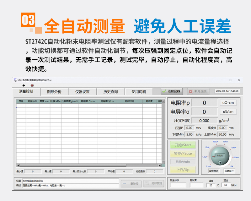 苏州晶格ST2742C粉末电阻率测试仪是一台小型化、自动化粉末电阻率测试仪,