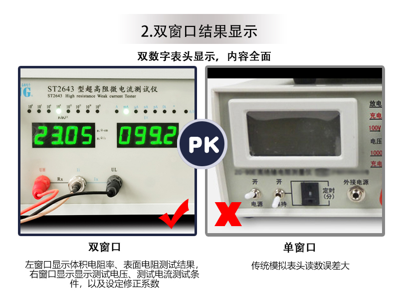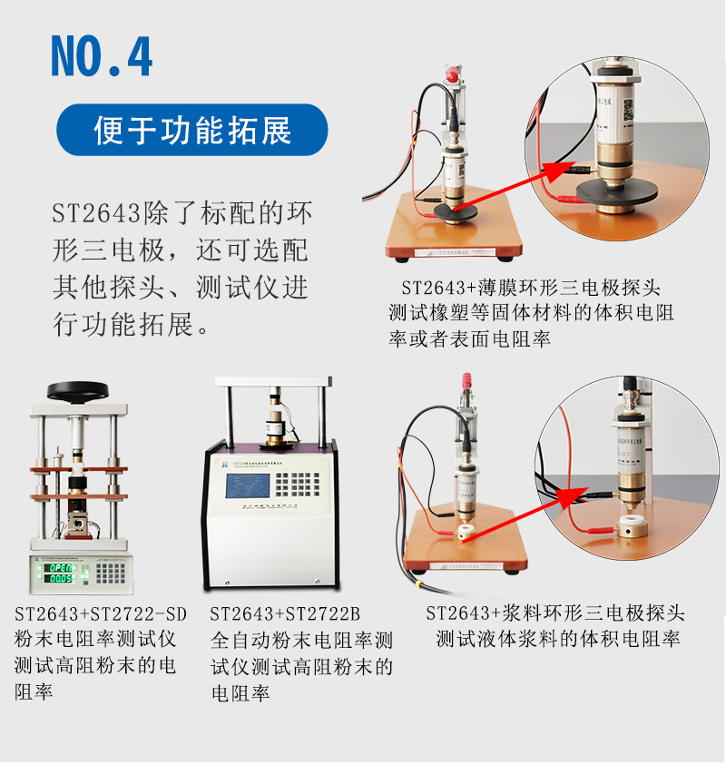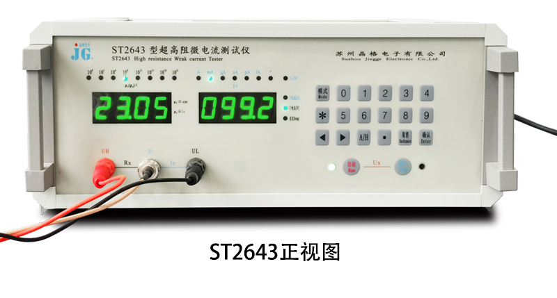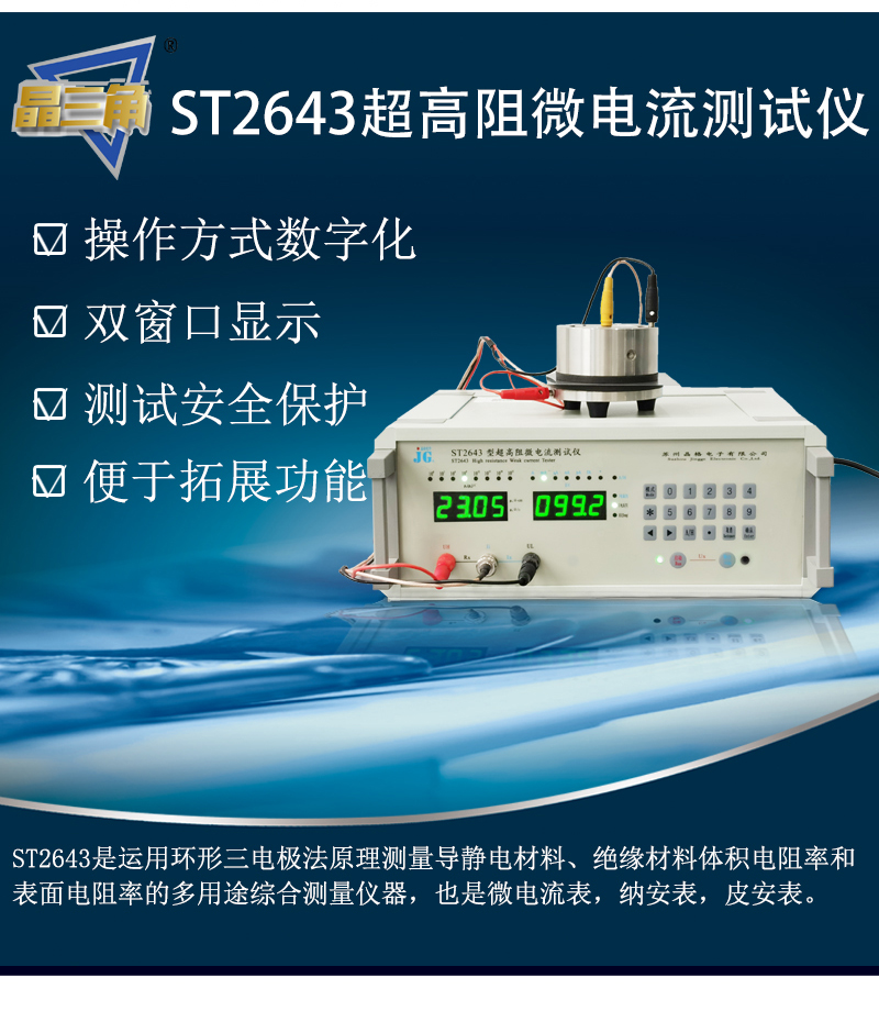 ST2643型表面电阻测试仪,是运用环形三电极法原理测量涂层状、薄膜状导静电材料的体积电阻率测试仪和表面电阻率测试仪,可测高阻薄膜、涂层表面电阻,橡塑制品表面电阻率体积电阻率。晶格原厂ST2643绝缘材料体积电阻率测试仪表面电阻率测试仪