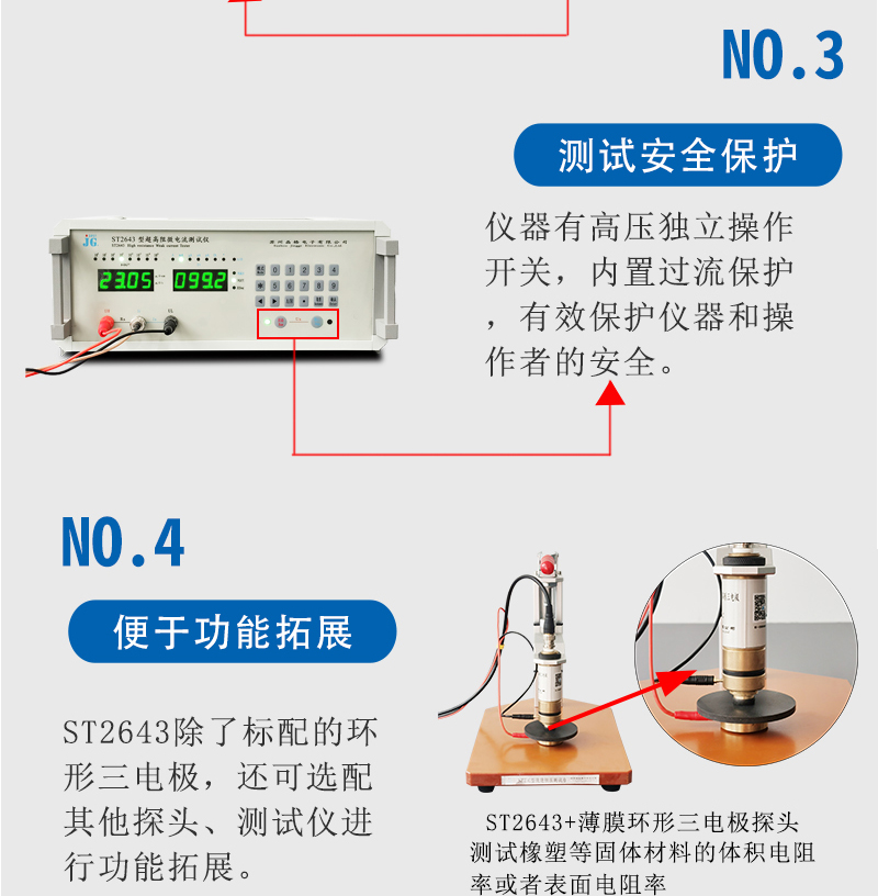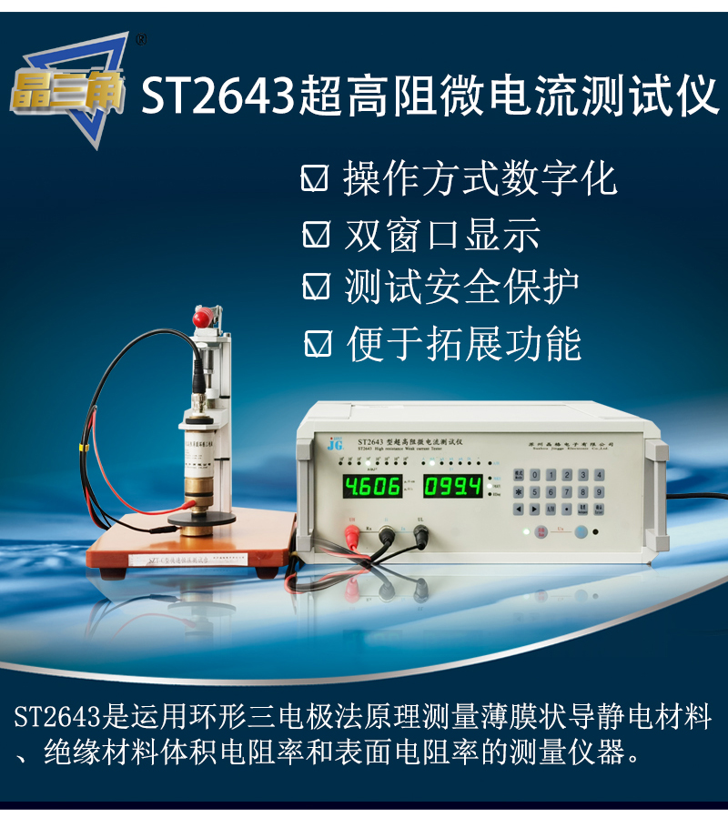 苏州晶格ST2643体积电阻率测试仪,搭配薄膜环形三电极测试探头可成为