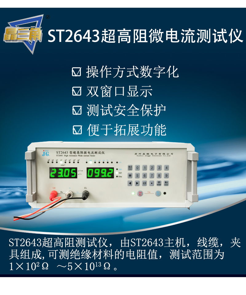 产品名称:苏州晶格ST2643超高阻测试仪 绝缘材料电阻测量仪源头厂家